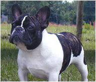 El bulldog francés no es simplemente un bulldog miniatura. Su característica más notable es la oreja de murciélago, que se presenta de forma natural y nunca se corta ni se altera. También es exclusivo de la raza el cráneo, que es plano entre las orejas. El bulldog francés es un perro compacto y musculoso con un pelaje corto y liso. Los colores comunes de la raza incluyen el leonado, el blanco y variedades de atigrado. Los machos y las hembras pesan entre 25 y 27 kg.