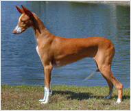 El sabueso ibicenco (pronunciado i-bi-tan) guarda un asombroso parecido con el dios egipcio Anubis. Perteneciente a la familia de los lebreles, esta raza se basa en las líneas generales del galgo, con patas largas y delgadas, cuerpo relativamente estrecho, lomo ligeramente arqueado, cintura estrecha y cola larga. Salvo por sus grandes orejas, el sabueso ibicenco es una versión algo discreta del galgo.